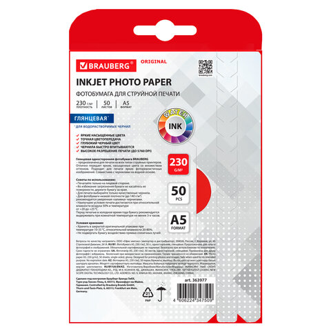 Фотобумага глянцевая, А5, 230 г/м2, односторонняя, 50 листов, BRAUBERG ORIGINAL, 363977