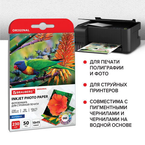 Фотобумага матовая, 10х15 см, 230 г/м2, односторонняя, 50 листов, BRAUBERG ORIGINAL, 363974