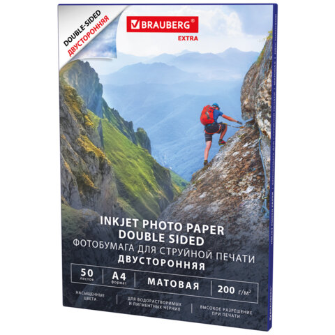 Фотобумага матовая, А4, 200 г/м2, двусторонняя, 50 листов, BRAUBERG EXTRA, 364489