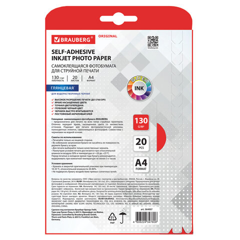 Фотобумага САМОКЛЕЯЩАЯСЯ глянцевая, А4, 130 г/м2, 20 листов, BRAUBERG ORIGINAL, 364007