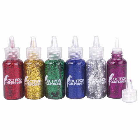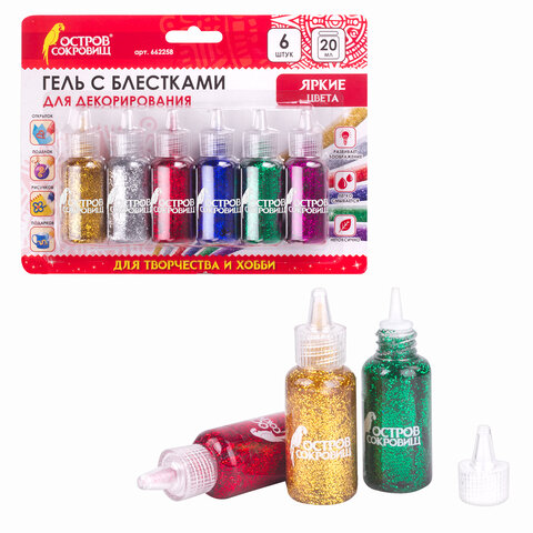Гель с блестками ОСТРОВ СОКРОВИЩ, для декора, поделок, DIY, творчества, оформления, 6 ярких цветов по 20 мл, блистер, 662258