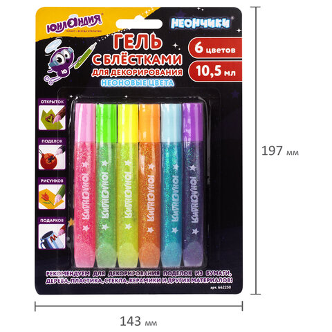Гель с блестками ЮНЛАНДИЯ "НЕОНЧИКИ", для декора, поделок, DIY, творчества, оформления, 6 цветов по 10,5 мл, блистер, 662250