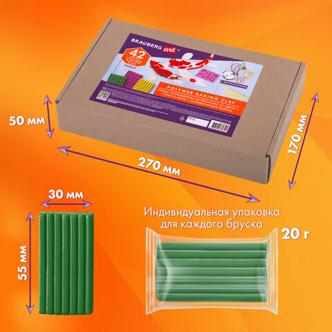 Глина полимерная запекаемая, НАБОР 42 цвета по 20 г, с аксессуарами, в гофрокоробе, BRAUBERG, 271160