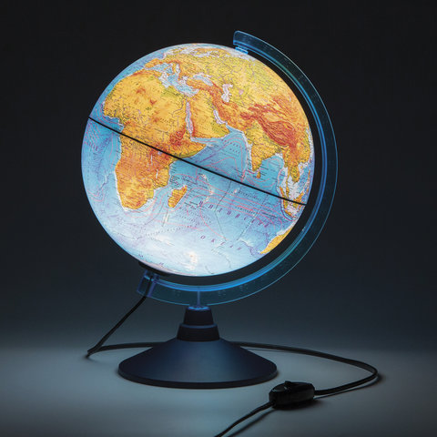 Глобус позволит ознакомиться с физической картой мира. Подходит для использования в детских садах и школах. Поможет узнать рельеф земной поверхности, абсолютные глубины океанов, найти самые высокие и самые глубокие места планеты.