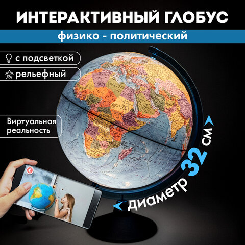Глобус интерактивный + очки VR, физический / политический, GLOBEN, 32 см, рельефный, с подсветкой, INT13200290