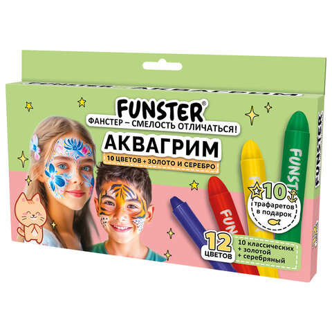 Аквагрим для лица и тела, 12 цветов (10 классических + золото + серебро), 10 трафаретов, FUNSTER (ФАНСТЕР), 192572