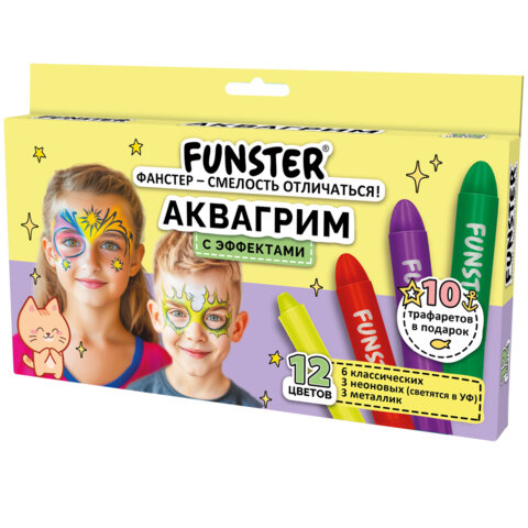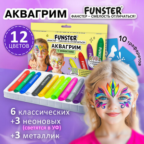 Аквагрим для лица и тела, 12 цветов (6 классических + 3 неоновых + 3 металлик), 10 трафаретов, FUNSTER (ФАНСТЕР), 192575