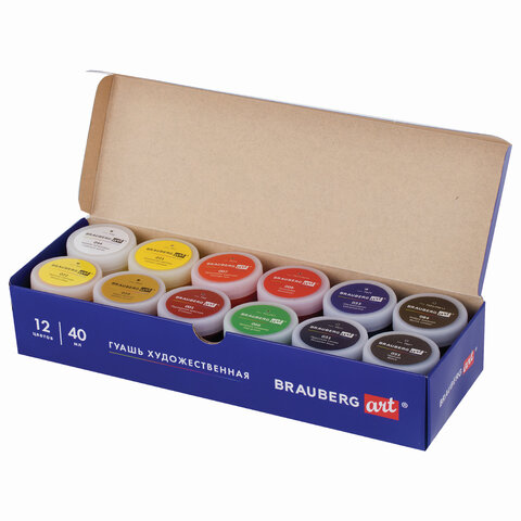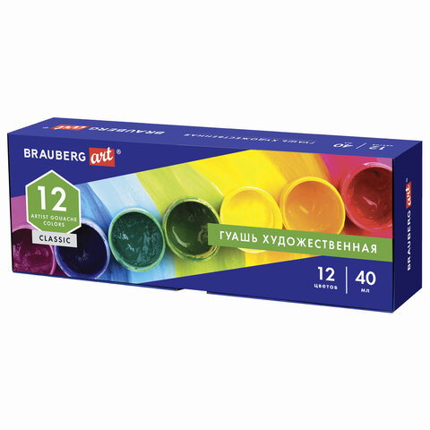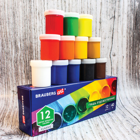 Гуашь художественная BRAUBERG ART CLASSIC, НАБОР 12 цветов в баночках по 40 мл, 191586