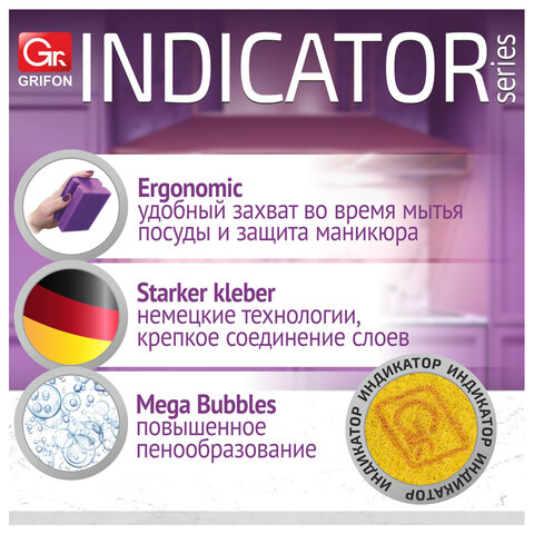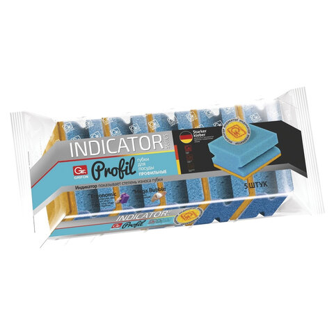 Губки для посуды 95х65х45 мм, КОМПЛЕКТ 5 шт., поролон/абразив, ПРОФИЛЬНЫЕ, ИНДИКАТОР ЗАМЕНЫ, GRIFON, 910-038