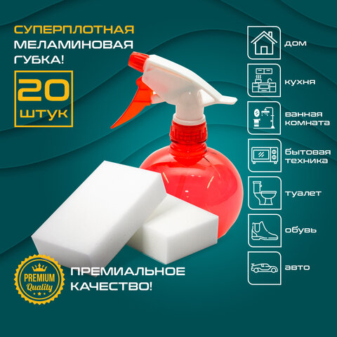 Губка-ластик МЕЛАМИНОВАЯ для удаления пятен, для чистки кухни, уборки, обуви, 10х7х3 см, КОМПЛЕКТ 20 шт., полибэг, LAIMA, 608955.