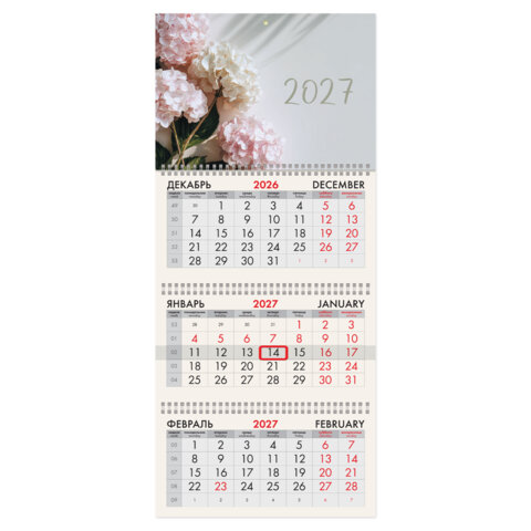Календарь квартальный 2027г, 3 блока 3 гребня, бегунок, офсет, BRAUBERG, "Букет гортензий", 118255