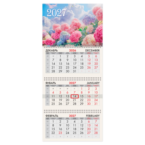Календарь квартальный 2027г, 3 блока 3 гребня, бегунок, офсет, BRAUBERG, "Гортензии", 118259
