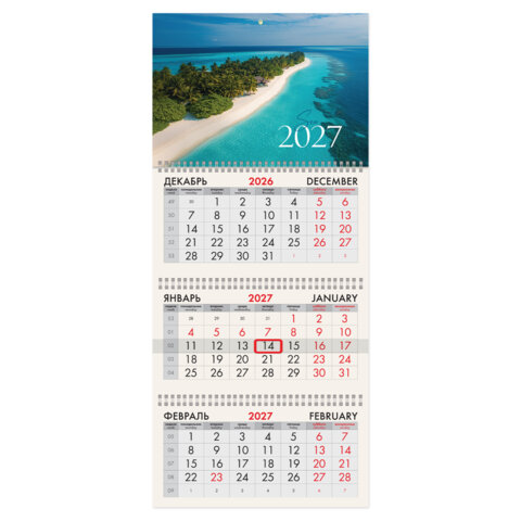Календарь квартальный 2027г, 3 блока 3 гребня, бегунок, офсет, BRAUBERG, "Лазурный пляж", 118265