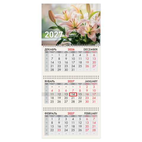 Календарь квартальный 2027г, 3 блока 3 гребня, бегунок, офсет, BRAUBERG, "Лилии", 118258