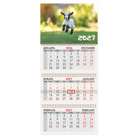 Календарь квартальный 2027г, 3 блока 3 гребня, бегунок, офсет, BRAUBERG, "Веселая козочка", 118246