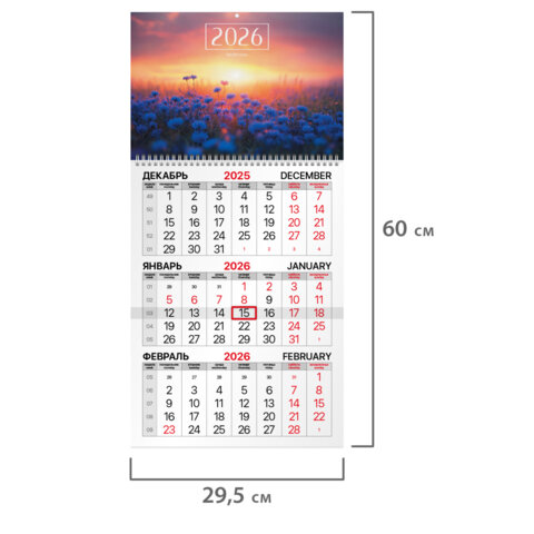 Календарь квартальный на 2026 г., 1 блок, 1 гребень, бегунок, мелованная бумага, BRAUBERG, "Васильковый луг", 116751