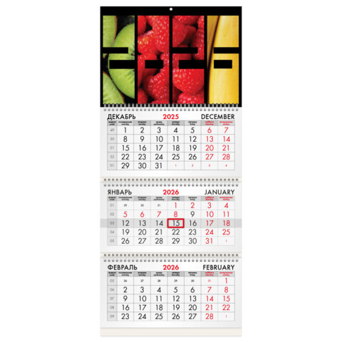 Календарь квартальный на 2026 г., 3 блока, 3 гребня, бегунок, офсет, BRAUBERG, "Фрукты", 116775
