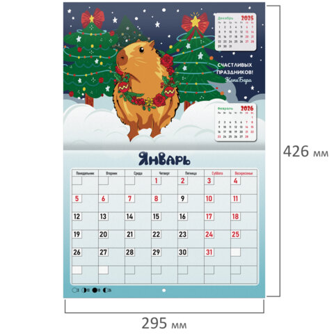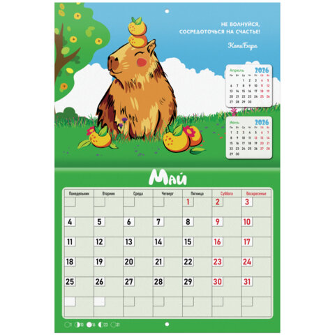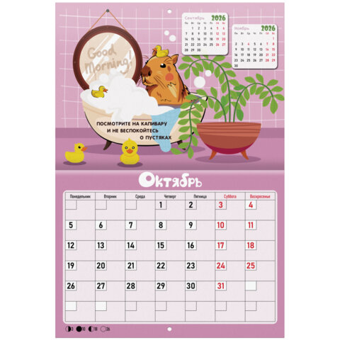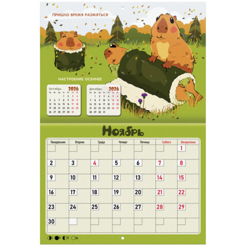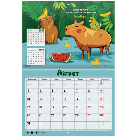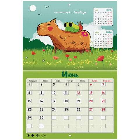 Календарь-планер настенный перекидной на 2026 г., BRAUBERG, 12 листов, 29,5х21,3 см, "Капибара", 116953