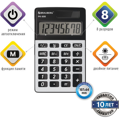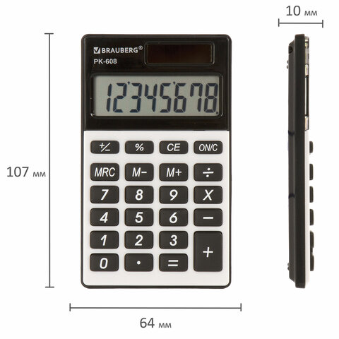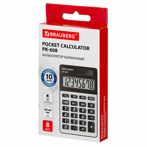 Карманный калькулятор BRAUBERG PK-608 - компактный, прочный и надежный. Его удобство оценят и взрослые и дети.