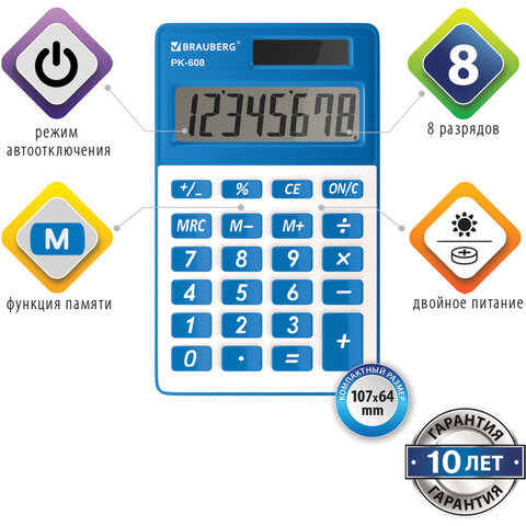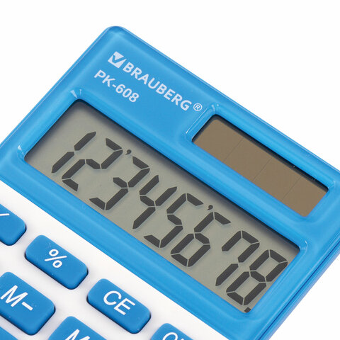 Калькулятор карманный BRAUBERG PK-608-BU (107x64 мм), 8 разрядов, двойное питание, СИНИЙ, 250519