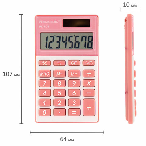 Калькулятор карманный BRAUBERG PK-608-PK (107x64 мм), 8 разрядов, двойное питание, РОЗОВЫЙ, 250523