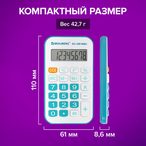 Карманный калькулятор со шнурком BRAUBERG DC-109-WBU – компактный и надежный помощник в работе и учебе. Его удобно использовать в офисе, школе и в быту.