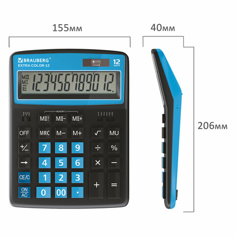 Калькулятор настольный BRAUBERG EXTRA COLOR-12-BKBU (206x155 мм), 12 разрядов, двойное питание, ЧЕРНО-ГОЛУБОЙ, 250476