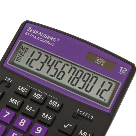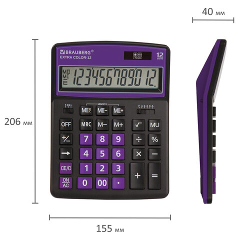 Калькулятор настольный BRAUBERG EXTRA COLOR-12-BKPR (206x155 мм),12 разрядов, двойное питание, ЧЕРНО-ФИОЛЕТОВЫЙ, 250480