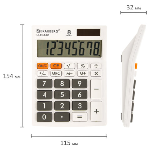 Калькулятор настольный BRAUBERG ULTRA-08-WT, КОМПАКТНЫЙ (154x115 мм), 8 разрядов, двойное питание, БЕЛЫЙ, 250512