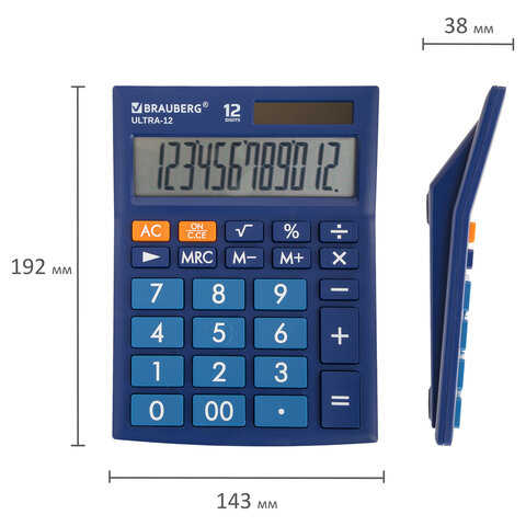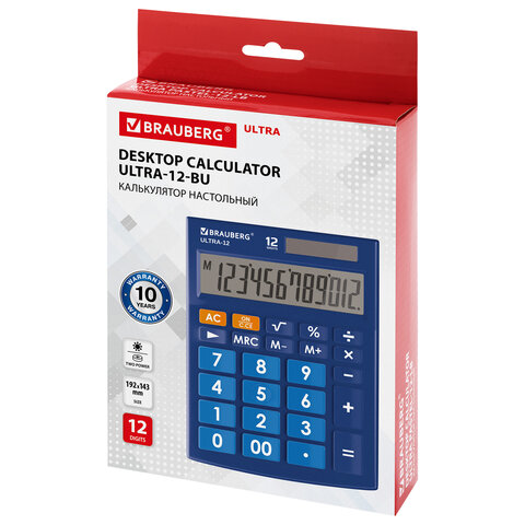 Калькулятор настольный BRAUBERG ULTRA-12-BU (192x143 мм), 12 разрядов, двойное питание, СИНИЙ, 250492