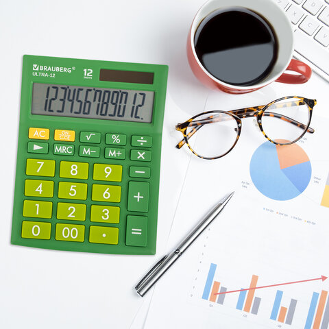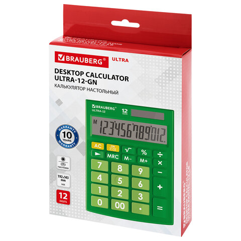 Настольный калькулятор BRAUBERG ULTRA-12-GN. Большой яркий дисплей, устойчивый корпус с прорезиненными ножками и крупная клавиатура с цветной дифференциацией позволяют работать эффективнее с максимальным комфортом.