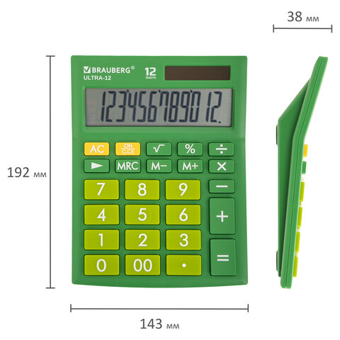 Калькулятор настольный BRAUBERG ULTRA-12-GN (192x143 мм), 12 разрядов, двойное питание, ЗЕЛЕНЫЙ, 250493