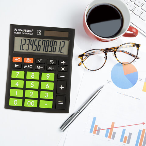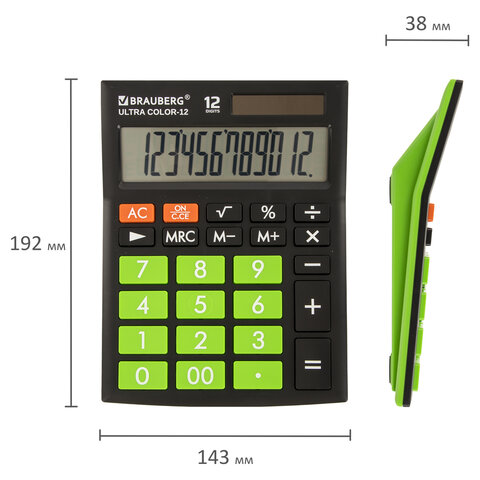 Калькулятор настольный BRAUBERG ULTRA COLOR-12-BKLG (192x143 мм), 12 разрядов, двойное питание, ЧЕРНО-САЛАТОВЫЙ, 250498