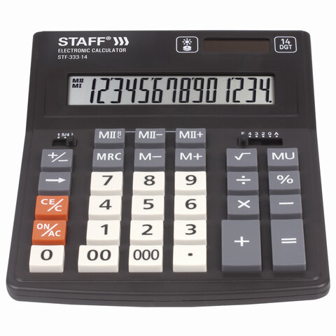 Простой в использовании и точный в расчётах настольный калькулятор STAFF PLUS STF-333 выполняет все необходимые вычисления на работе и дома. Кнопки нажимаются легко и приятно, эргономичный наклон корпуса позволяет работать с максимальным комфортом.