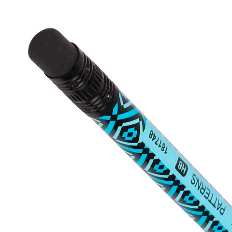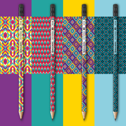 Карандаш чернографитный BRAUBERG "PATTERNS", 1 шт., HB, с ластиком, корпус ассорти, 181748
