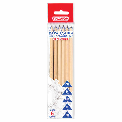 Карандаши чернографитные чертежные школьные разной твердости, НАБОР 6 штук: 2H-2B, ПИФАГОР, 181999