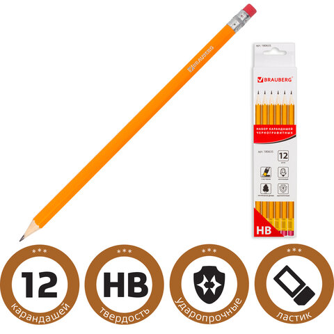 Карандаши чернографитные простые с ластиком HB, ВЫГОДНАЯ УПАКОВКА КОМПЛЕКТ 12 штук, BRAUBERG, 180635