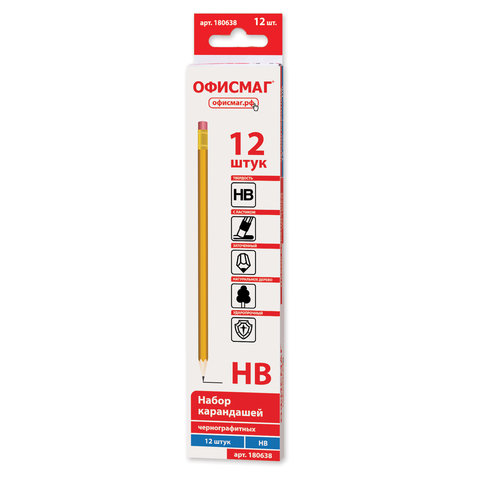 Карандаши чернографитные простые с ластиком HB, ВЫГОДНАЯ УПАКОВКА КОМПЛЕКТ 12 штук, ОФИСМАГ, 180638