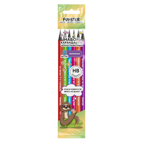 Набор карандашей чернографитных с мемной надписью FUNSTER (ФАНСТЕР) FUNNY NOTES CLRD, 6 штук, HB, с ластиком, 182040