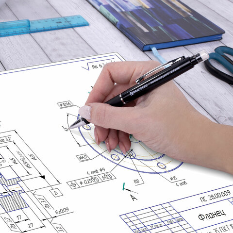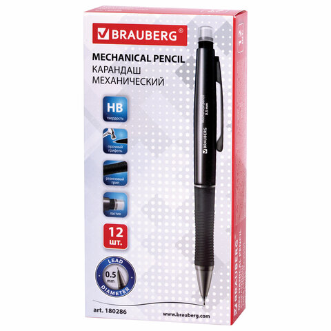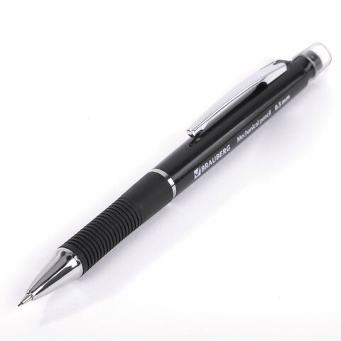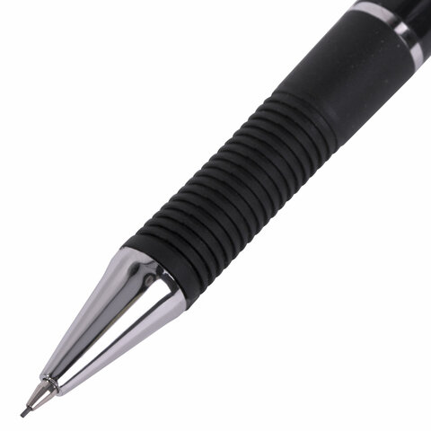 Механический карандаш BRAUBERG с корпусом черного цвета и и удобным резиновым упором, исключающим скольжение пальцев во время письма.