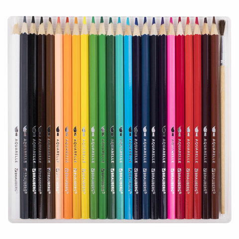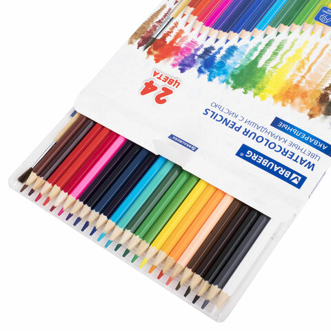 Карандаши цветные акварельные BRAUBERG 24 цвета с КИСТЬЮ, шестигранные, грифель 3 мм, натуральное дерево, 181849