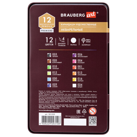 Карандаши художественные цветные акварельные BRAUBERG ART PREMIERE, 12 цветов, грифель 4 мм, металл, 181533