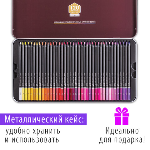 Карандаши художественные цветные BRAUBERG ART PREMIERE, НАБОР 120 цветов, 4 мм, металл кейс, 181692