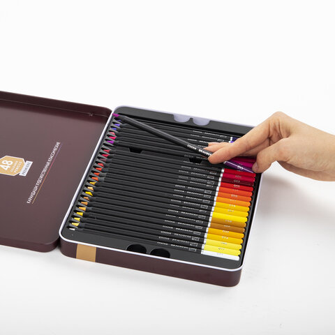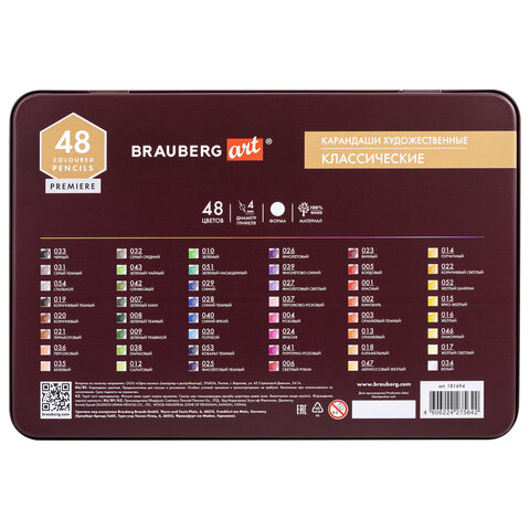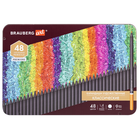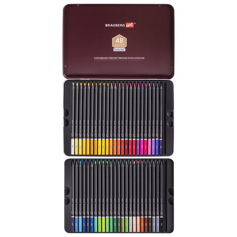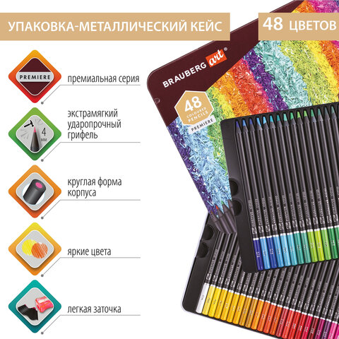 Карандаши цветные художественные BRAUBERG ART PREMIERE, НАБОР 48 цветов, 4 мм, металл кейс, 181694