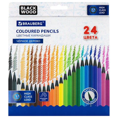 Карандаши цветные BRAUBERG, 24 цвета, шестигранные, грифель 3,3 мм, черное дерево, 181858