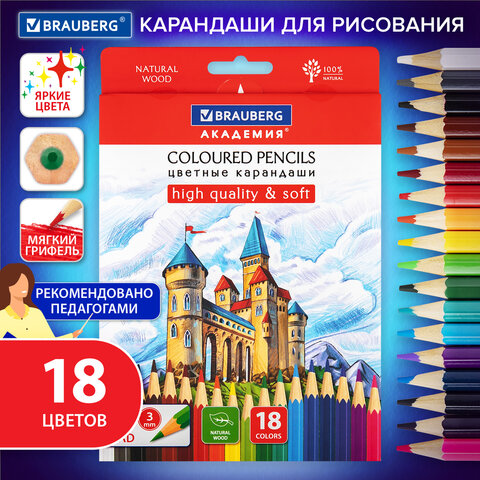 Карандаши цветные мягкие BRAUBERG АКАДЕМИЯ, 18 цветов, шестигранные, грифель 3 мм, натуральное дерево, 181865