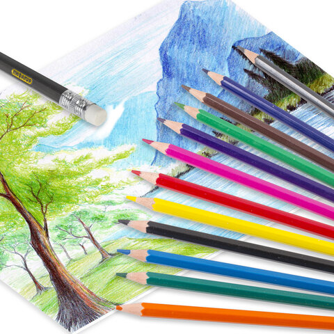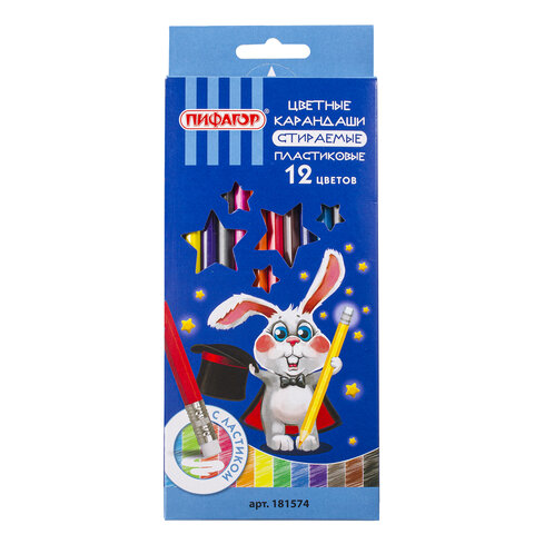 Карандаши цветные стираемые с ластиком ПИФАГОР "МАГИЯ", 12 цветов, шестигранные, 181574, 50