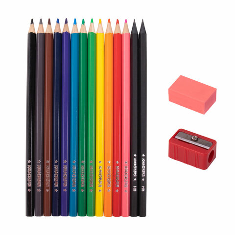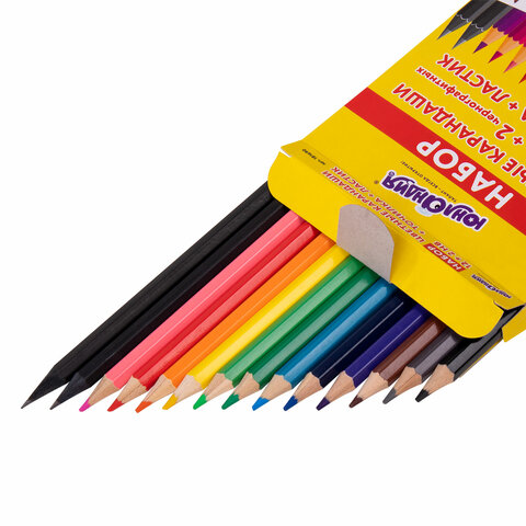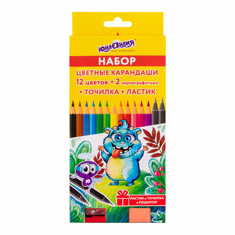 Карандаши цветные ЮНЛАНДИЯ "МОНСТРИК", 12 цветов + 2 чернографитных карандаша + ЛАСТИК + ТОЧИЛКА, шестигранные, натуральное дерево, 181690