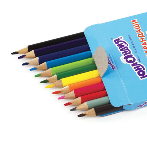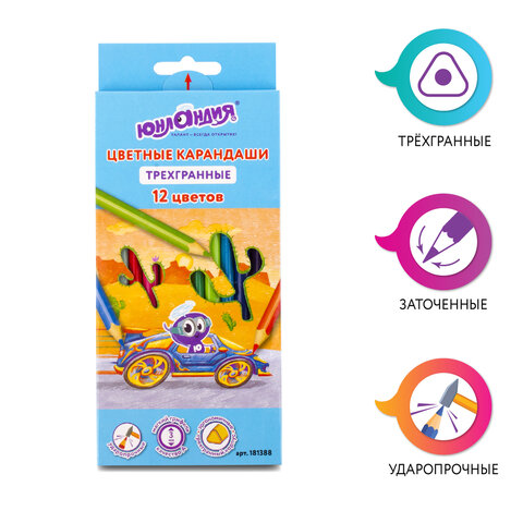 Карандаши цветные ЮНЛАНДИЯ "ЮНЛАНДИК БЫСТРЕЕ ВСЕХ", 12 цветов, трехгранные, грифель 3 мм, натуральное дерево, 181388