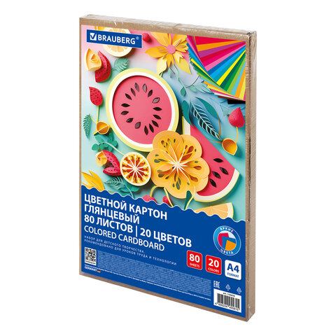 Картон цветной А4 МЕЛОВАННЫЙ, 80 листов, 20 цветов, в коробке, BRAUBERG, 200х290 мм, "Фруктовый микс", 116418